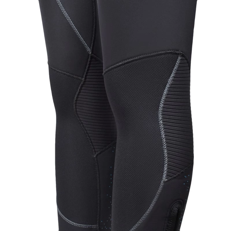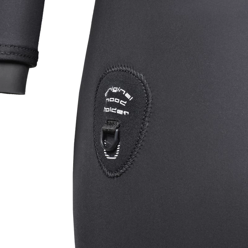 Manchon visage aminci (-2 mm) sur la monopièce col avec une zone autour du visage sans couture pour plus de confort, d’étanchéité et de durabilité. Col lisse intérieur pour plus d’étanchéité et fermeture finement ajustable grâce à un velcro élastique et un grip non agressif qui ne s’agrippe pas sur le jersey et les coutures. Double manchon poignet et cheville zippé avec manchon intérieur à retourner, en jersey intérieur et néoprène lisse extérieur. L’extrémité de la couture d’assemblage des manchons intérieurs est coupée à 45° pour plus d’élasticité et de solidité lors de l’habillage.