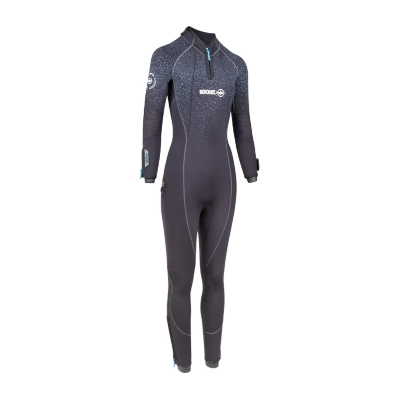 Grand zip d’aisance au niveau de la glotte équipé d’un soufflet tendu Elaskin intégrant une coupe anatomique sur la monopièce sans cagoule pour un meilleur confort. Grand Zip dorsal « G-Lock plus » (monopièce col) avec curseur métal et sous-patte au profil embossé Water Dam System pour une étanchéité accrue (brevet Beuchat) Zip poignet et cheville Renforcement du néoprène à l’extrémité de tous les Zips pour éviter tout risque de déchirure si le plongeur force en tirant sur les curseurs.